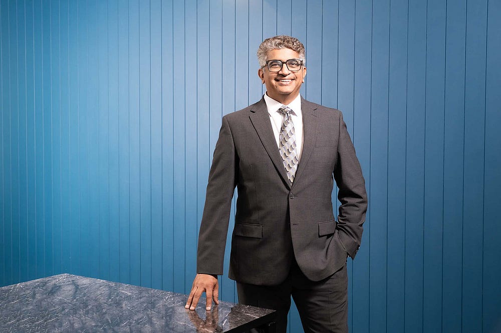 For our next portrait subject, the client wanted a more minimalistic feel. I was drawn to the blue wall and thought it would make for an interesting contrast with the grey suit of the subject. I made sure to leave some negative space to the left of the client in case they wanted to fill it with text for a press release.